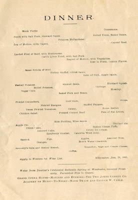 Hotels that included room and board in the daily rate did not have prices on their menus. Typical for a hotel of its class, this dinner featured a couple of interesting dishes, such as celery ice cream and pieplant pie (i.e. rhubarb pie). What’s notable about this table d’hôte menu from January 28, 1885 is the notice at the bottom informing diners that Twain and Cable were appearing at the nearby Academy of Music.