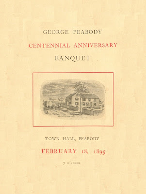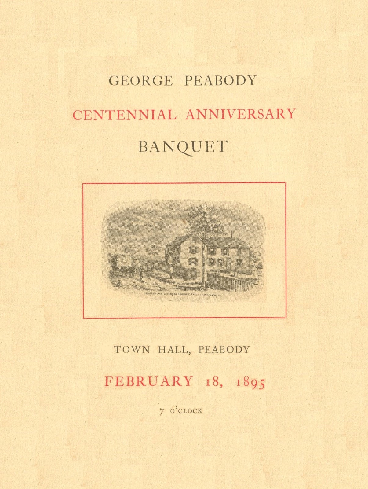 George Peabody established numerous educational trusts that still bear his name, winning him many admirers. He continued to be remembered long after his death. Despite being in the grips of a harsh economic depression, the town of Peabody marked the centennial of his birth at this banquet in 1895.